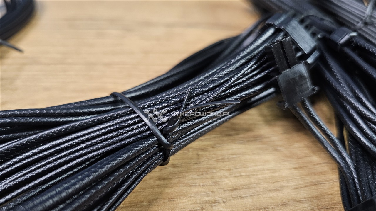 Oprócz wiązki głównej 24-pin w wersji niedzielonej mamy do dyspozycji dwa kable EPS, trzy przewody PCI-E (6+2)-pin oraz jeden dodatkowy przewód PCIe 5.1 12V-2x6 o mocy 600 W. Na nośniki danych i akcesoria producent przewidział dwie wiązki SATA oraz jedną z czterema wtykami Molex. Kable są odpowiednio długie i mimo większego przekroju przewodów wysokoprądowych pozostają elastyczne, co jest zasługą indywidualnych żył oraz zastosowanego tłoczenia izolacji. Pod względem estetyki i wygody montażu musze przyznać że przewody są nieco sztywne, poza tym dodatkowe plastikowe organizery pomagają utrzymać porządek w obudowie.