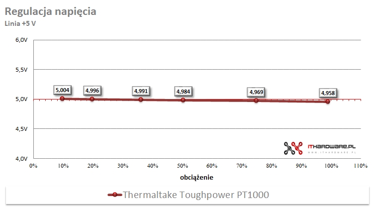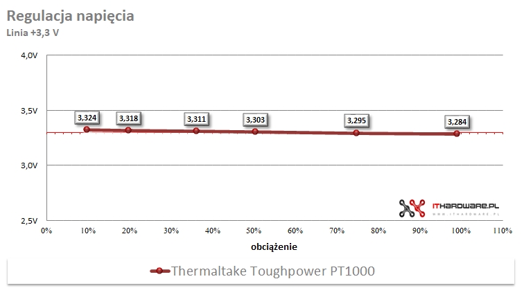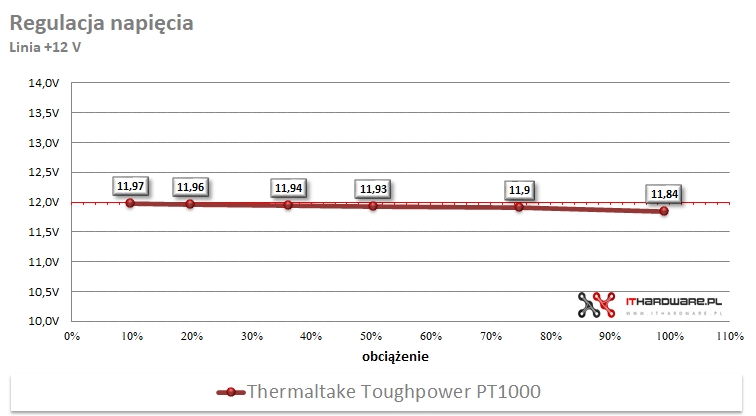 Regulacja napięć w zasilaczu Thermaltake Toughpower PT1000 stoi na bardzo dobrym poziomie i w tej klasie możemy mówić o naprawdę solidnym wyniku. Dla linii +3,3 V maksymalne odchylenie wyniosło 1,20%, natomiast w przypadku +5 V odnotowano 0,92%. Kluczowa linia +12 V charakteryzowała się stabilnością na poziomie 1,09%, co w praktyce oznacza bardzo dobrą kontrolę napięć w całym zakresie obciążenia.