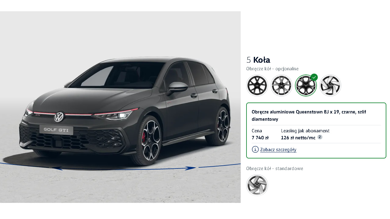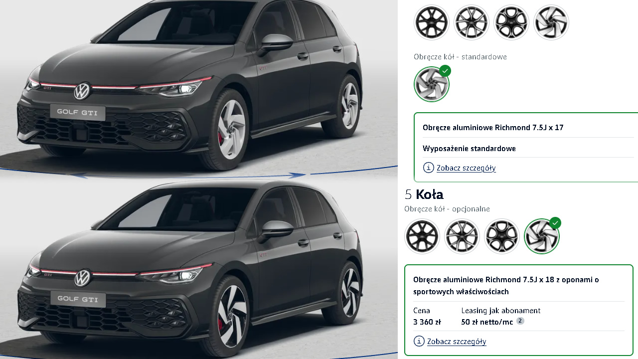 Biorąc powyższe pod uwagę, nie wydaje mi się, by zasadnym było branie aż 19-calowych felg do Golfa GTI. W zupełności wystarczą 18” – szkoda tylko, że dostępny jest tylko jeden wzór. Felgi 17” są jednak za małe i znacząco odbierają charakter temu samochodowi.