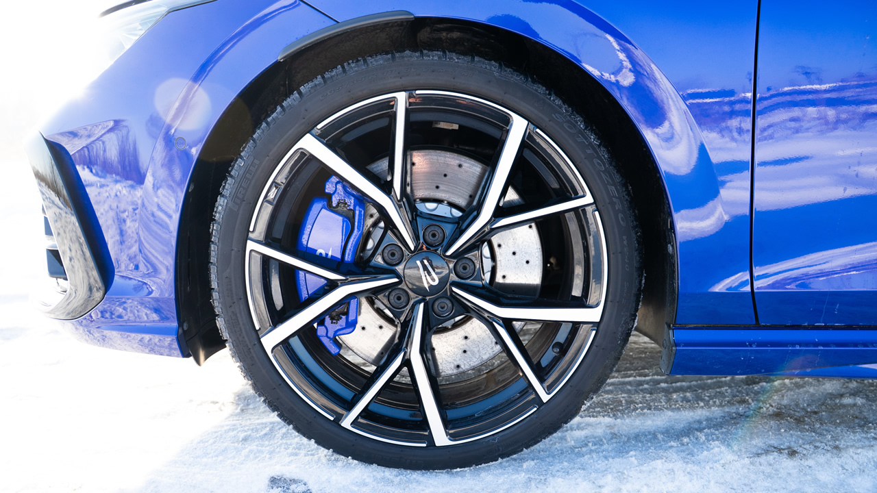 Realistycznie jednak Volkswagen Golf GTI (w podstawowej odmianie) niespecjalnie sprawdzi się na torze wyścigowym. Ma po prostu zbyt słabe hamulce. Mi udało się je zgrzać po kilku minutach bardzo ostrej, ale jednak zimowej jazdy z zimowymi oponami oczywiście (Continental WinterContact TS 870P – swoją drogą, że dają bardzo dobre wyczucie przyczepności). I tutaj widać zasadniczą różnicę względem Golfa GTI Clubsport, który ma hamulce jak w Golfie R – tarcze o większej średnicy, nawiercane, dużo bardziej wytrzymałe na powtarzające się mocne hamowanie.