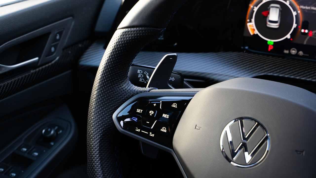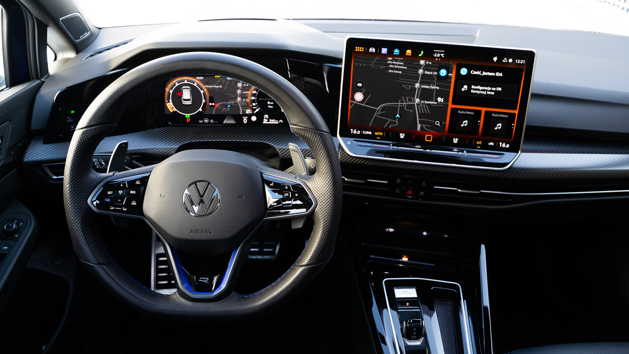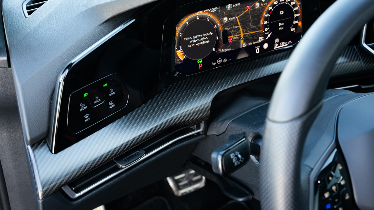 Golf R wyróżnia się jednak we wnętrzu pewnymi istotnymi detalami. Po pierwsze: łopatki do ręcznej zmiany biegów przy kierownicy są wyraźnie większe (bardziej podłużne). Po drugie panele dotykowe (niestety) na kierownicy mają zaznaczone na niebiesko pole z literką „R” – to szybki dostęp do zmiany trybów jazdy. Po trzecie: można oczywiście też skonfigurować wnętrze auta w taki sposób, by pojawiło się tam kilka elementów wykonanych z włókna węglowego.