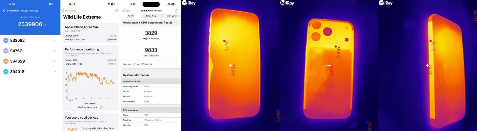 Niemniej, sprzęt przez cały czas trwania testów działał niezwykle płynnie, przełączanie się między aplikacjami odbywało się praktycznie natychmiast, nawet jeśli w tle mieliśmy ich dziesiątki i nie było mowy o jakimkolwiek przeładowywaniu. Bardziej wymagające zadania, jak granie, również nie stanowią żadnego problemu i naprawdę trudno go czymś zaskoczyć, co pokazują także wyniki benchmarków. Od razu widać tu również, że nie ma jednak mowy o 40% skoku względem iPhone'a 16 Pro. A jak z kulturą pracy? Bardzo przyzwoicie, bo temperatura obudowy w okolicach 70% AnTuTu wynosiła maksymalnie 35,6 stopnia, czyli praktycznie 10 mniej niż w wersji Air i jakieś dwa stopnie mniej niż w iPhonie 16 Pro.