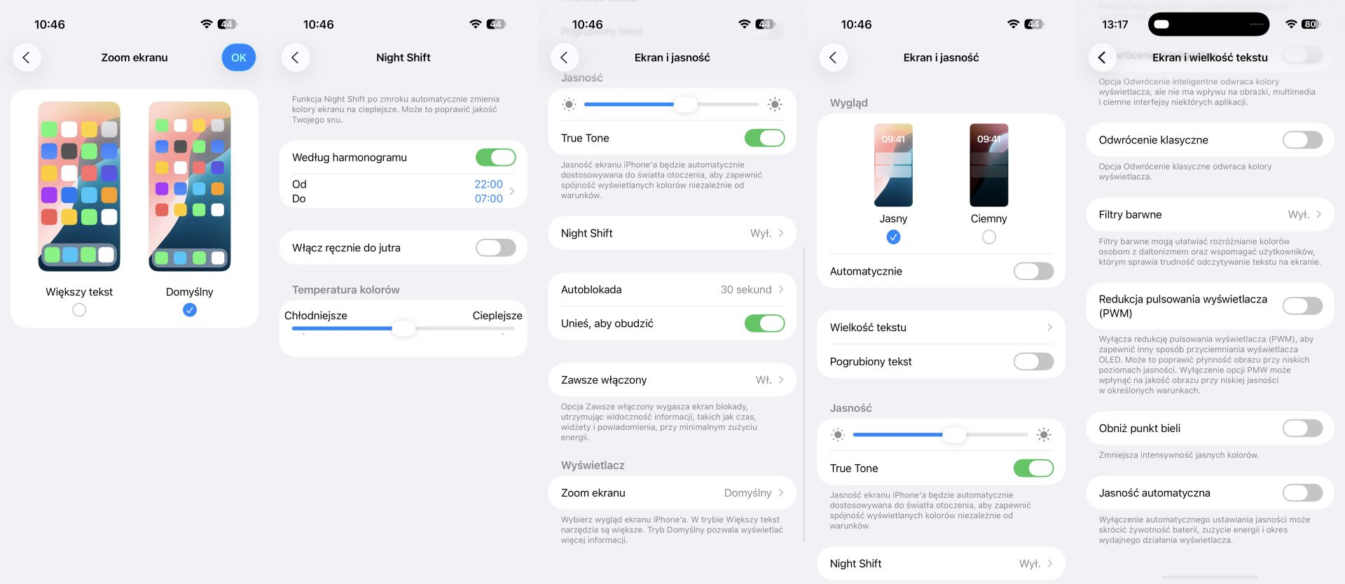 Co znajdziemy w ustawieniach? Możemy tu wybrać tryb ciemny z opcją automatycznego włączenia po zmroku czy według harmonogramu, ustawić wielkość tekstu i jego pogrubienie, dopasować poziom jasności (i włączyć True Tone), podświetlenie nocne Night Shift (manualnie albo harmonogram i temperatura kolorów), ustawić czas autoblokady i opcję Unieś, aby obudzić. Możemy też korzystać z Always-On Display, które w porównaniu z androidową konkurencją wciąż jest mocno okrojone z opcji. Szkoda też, że przełącznik jasności automatycznej wylądował w ustawieniach Dostępności, gdzie trudno go znaleźć, a nie razem z pozostałymi ustawieniami wyświetlacza.