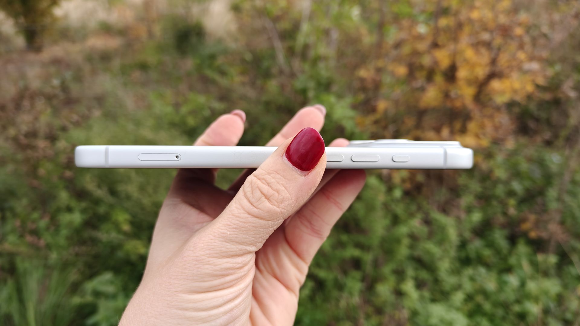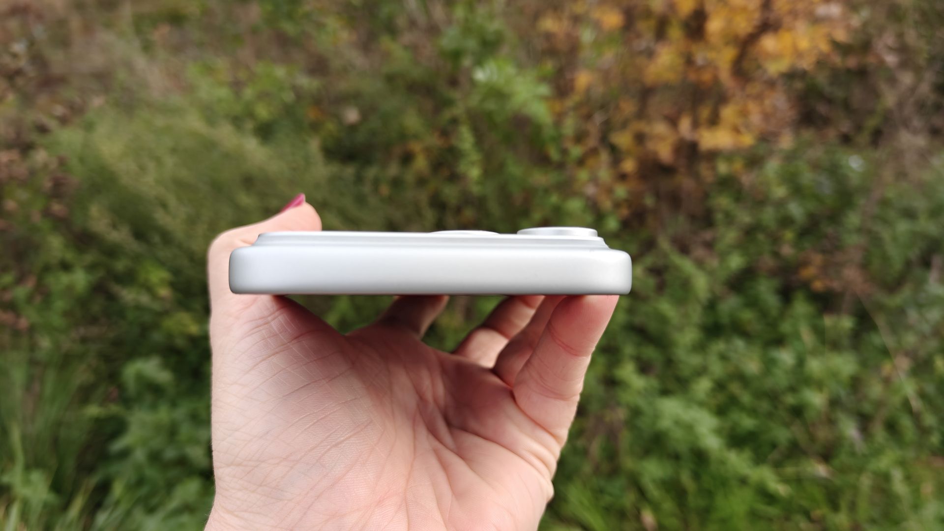 Większość z was na pewno widziała już w sieci zdjęcia czy filmy z tym modelem, więc dobrze wiecie, o czym mówię. Telefon porzuca dotychczasową stylistykę z płaskimi szklanymi pleckami, płaską tytanową ramką i małą wyspą aparatów na rzecz aluminiowego unibody. Oznacza to, że ramka boczna płynnie przechodzi w plecki, na których znajdziemy jednak dużą szklaną wstawkę (po odpakowaniu urządzenia wydawało mi się, że to jakaś ochronna naklejka do oderwania) i wyspę aparatów o szerokości blisko całego tyłu. Jakby tego było mało, w testowanej przeze mnie srebrnej wersji kolorystycznej wstawka jest biała, więc mocno się wyróżnia (miałam okazję zobaczyć też granatowy i pomarańczowy wariant, gdzie kolorystyka była spójna i wyglądało to znacznie lepiej).