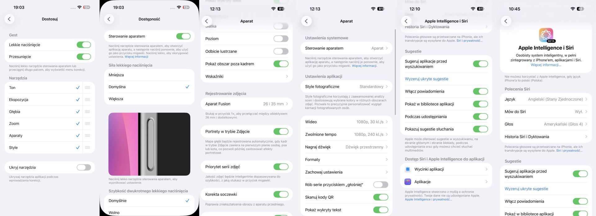 Co więcej, wprowadzony przez iOS 26 Liquid Design przyniósł też zmiany w samej aplikacji aparatu, która bardziej przypomina teraz androidowe rozwiązania i jest zdecydowanie przyjemniejsza w obsłudze. Jest w końcu opcja nagrywania z obiektywu głównego i przedniego jednocześnie, szystkie kluczowe tryby są teraz dostępne gestem przesunięcia w prawo i lewo (odpowiednio obrazy i wideo), a ustawienia przywołujemy naciskając ikonę w prawym górnym rogu lub przesuwając palcem z dołu krawędzi. Znajdziemy tam najpotrzebniejsze opcje, jak flesz, samowyzwalacz, ekspozycję, style czy format zdjęć. Duża część potrzebnych ustawień w końcu znalazła się w samej aplikacji aparatu i pod ręką, niemniej część pozostała w ustawieniach systemowych.